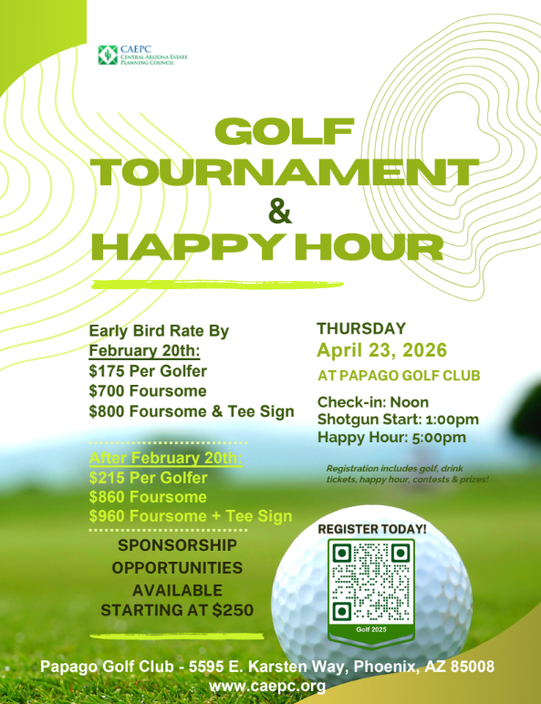 By registering for this event, you grant the Central Arizona Estate Planning Council (CAEPC) permission to take photographs or video of you during the event. These images and videos may be used on the CAEPC website, social media pages, and/or in newsletters for promotional purposes.