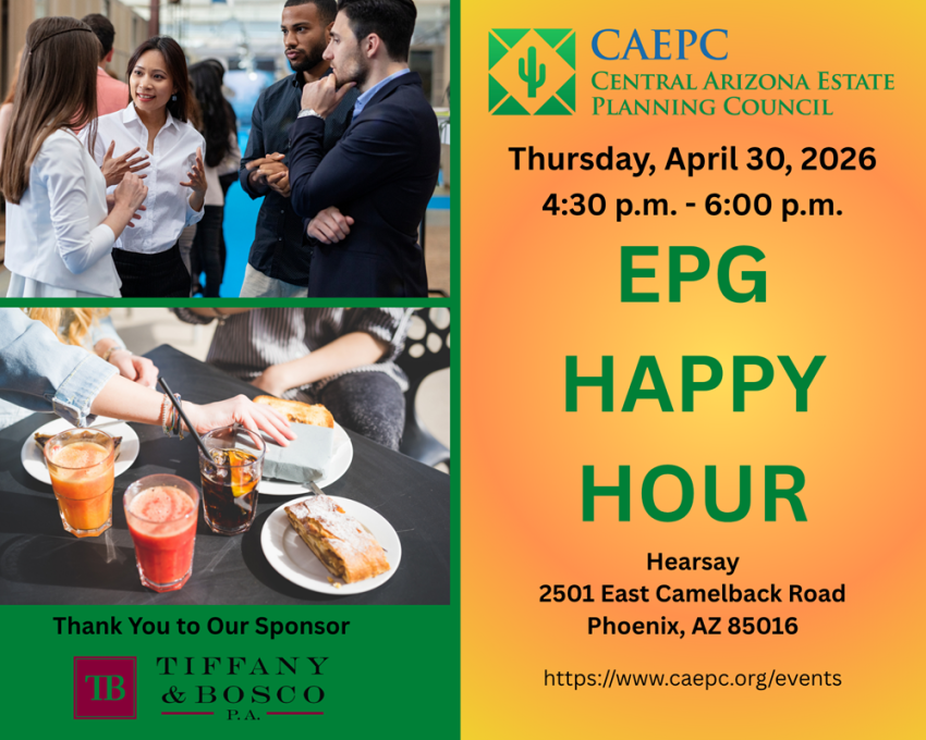 By registering for this event, you grant the Central Arizona Estate Planning Council (CAEPC) permission to take photographs or video of you during the event. These images and videos may be used on the CAEPC website, social media pages, and/or in newsletters for promotional purposes.